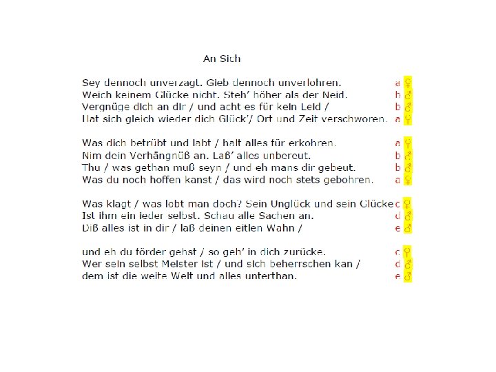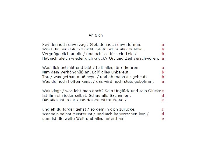 Umarmender Reim: abba Sonett: 14 Zeilen 2 Quartette: abba – abba 2 Terzette: cde – cde (oder: ccd – eed, cdc – dee usw. )