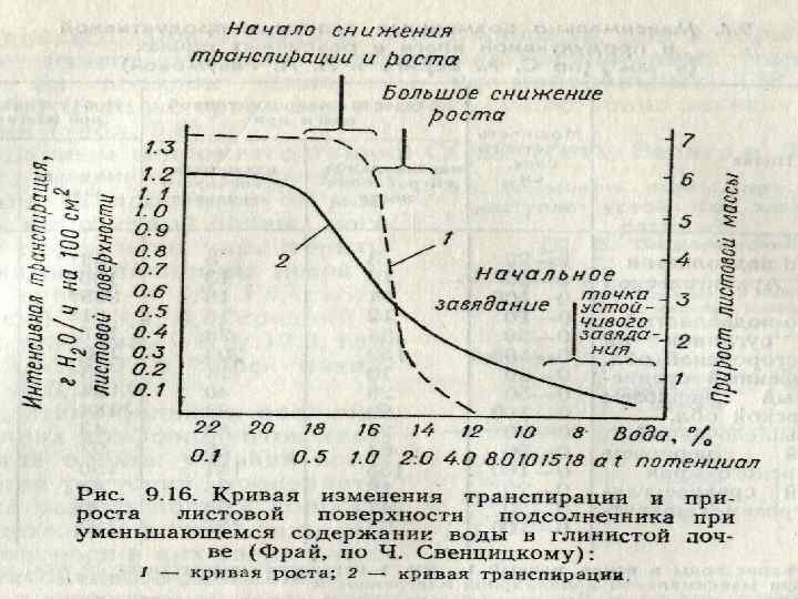 3. Почвенная влажность устойчивого завядания растений (ВУЗ) - количество воды в почве, при котором растения начинают устойчиво за вядать и сохраняют это состояние при помеще - нии их в атмосферу, насыщенную водяными парами. • Это нижний предел доступности воды расте- ниям в почве; 4. Влажность разрыва капилляров (ВРК) — количество воды в почве, при котором её подвижность резко уменьшается; • Влага трудноподвижна в почве и труднодоступна для растений.