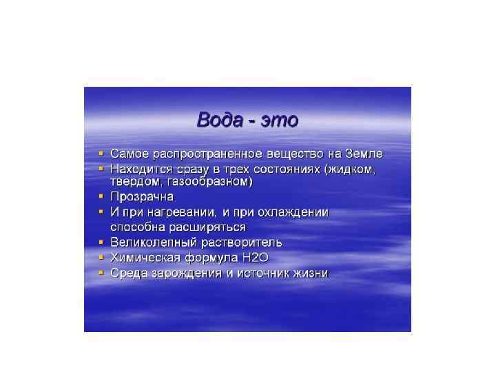 • Вода регулирует температуру тела • Вода помогает питательным веществам усваиваться организмом, являясь идеальным растворителем для органических и неорганических веществ. • Вода выводит токсины и продукты обмена из организма. • Вода нужна всем и всегда!!!