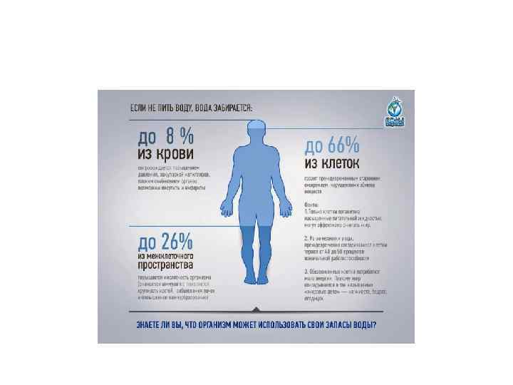 • Если испытываете жажду, на этот момент ваш организм имеет дефицит воды 1% от вашего водного объема. • При потере 2% воды – резко снижается выносливость, 3% - выраженное снижение мышечной силы, а при 5% дефиците резко снижается слюноотделение, повышается пульс, возникает апатия, головная боль, мышечная слабость и тошнота.