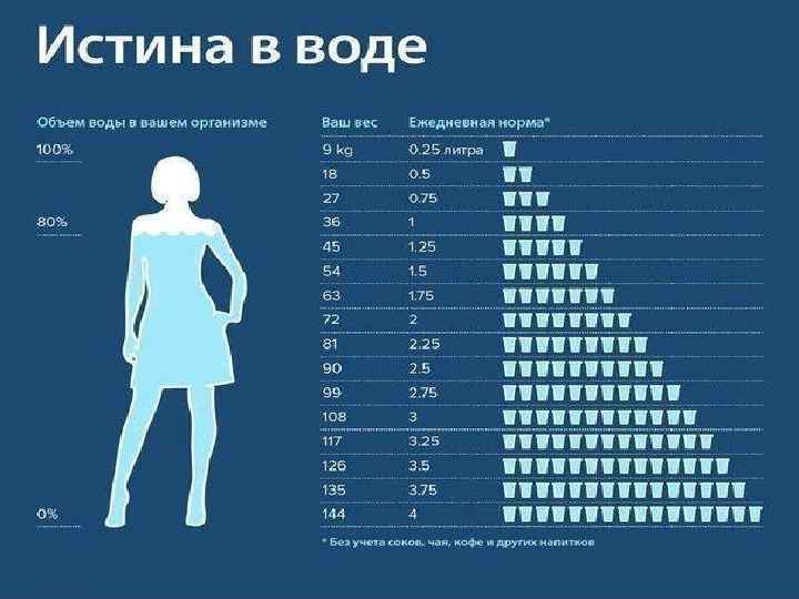 Человек на 60 -70% состоит из воды. Общий объем воды, необходимый человеку в сутки, равен 2 -2, 5 л. Через почки и мочевыводящие пути удаляется около 6575% воды.