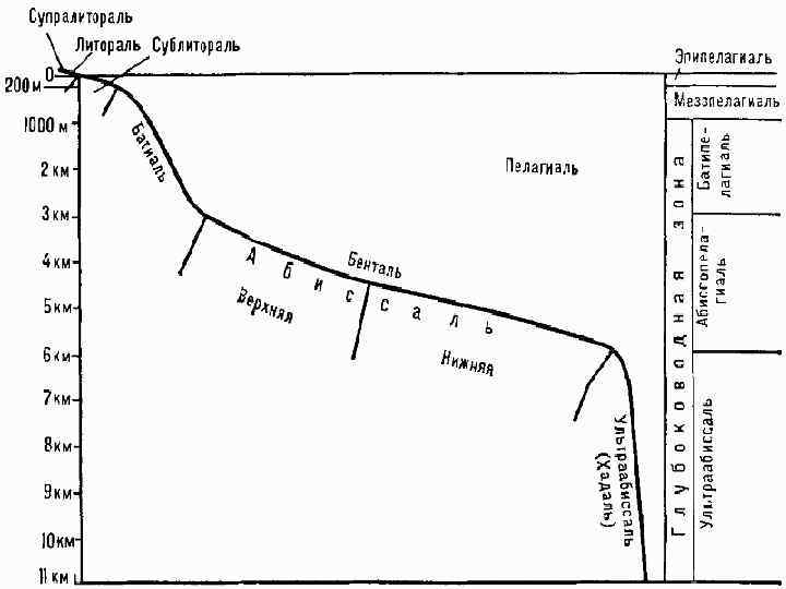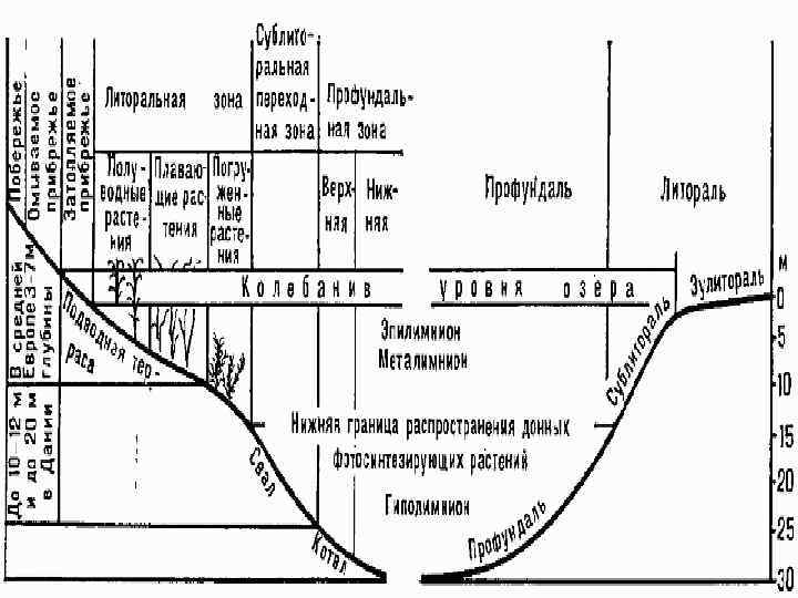 Экологические зоны озер В зависимости от крутизны спуска и глубины на дне тоже выделяют несколько зон, которым соответствуют указанные зоны пелагиали: - супралитораль – часть берега выше верхней приливной черты, куда долетают брызги прибоя. - литораль – кромка берега, заливаемая во время приливов. - сублитораль – плавное понижение суши до 200 м. - батиаль – крутое понижение суши (материковый склон), - абиссаль – плавное понижение дна океанского ложа; глубина обеих зон вместе достигает 3 -6 км. - ультраабиссаль – глубоководные впадины от 6 до 10 км.
