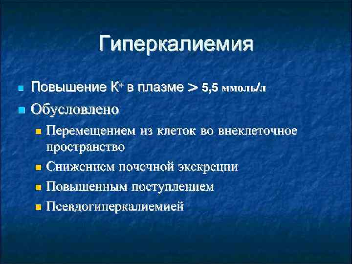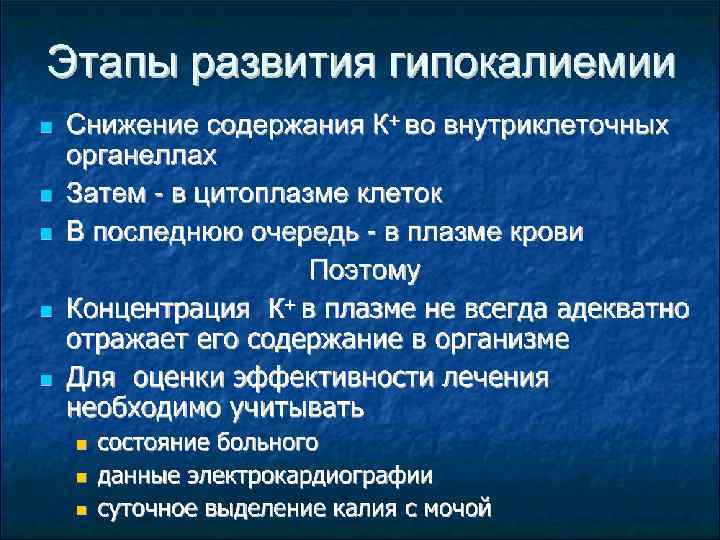 Гипокалиемия Снижение К+ вплазме<3. 5 ммоль/л Обусловлена перемещением из внеклеточного пространства в клетки: • Потерями • Недостаточным поступлением • Плохо коррелирует с дефицитом в организме Развивающаяся гипокалиплазмия свидетельствует о дефиците тканевого К+