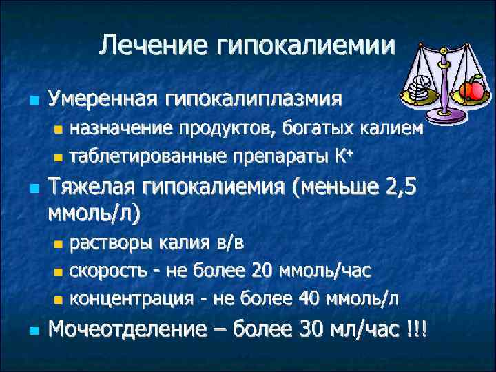 • Оценка общего содержания калия играет важную роль в лечении гипокалиемии и гиперкалиемии • (помним, что определить деи ствительное общее содержание К мы не можем, но все-таки есть корреляция между гипокалиемией и низким его общим содержанием; калии крови – плохой маркер избытка К).
