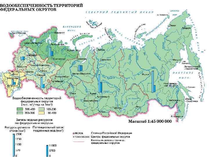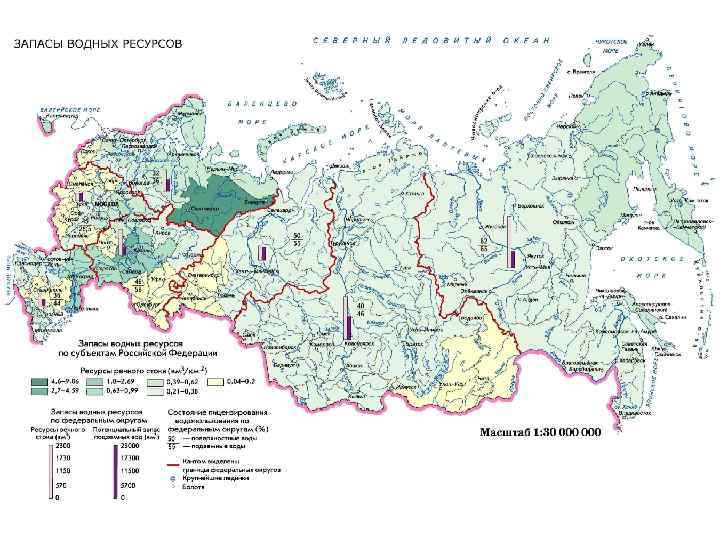 Ресурсы речного стока по федеральным округам Российской Федерации РФ/Федеральные округа Среднее многолетнее значение водных ресурсов, км 3 в год Российская Федерация 458, 6 Центральный 126, 5 Северо-Западный 607, 4 Южный 309, 0 Приволжский 271, 3 Уральский 597, 3 Сибирский 1321, 1 Дальневосточный 1847, 8