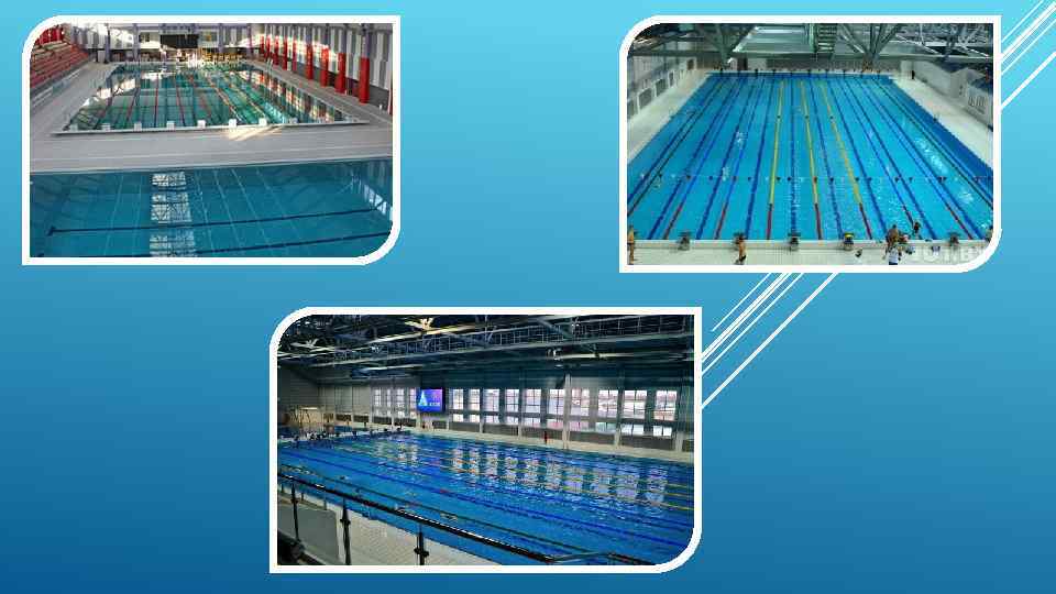 БАССЕЙНЫ – 2 БАССЕЙНА 25 -МЕТРОВЫХ ПО 4 ДОРОЖКИ КАЖДЫЙ, 50 МЕТРОВЫЙ 10 ДОРОЖЕК, ГЛУБИНА 2, 2 М, ПРЫЖКОВЫЙ 30 Х 30, ГЛУБИНА 7 МЕТРОВ (СИНХРОННОЕ ПЛАВАНИЕ, ПРЫЖКИ В ВОДУ, ВОДНОЕ ПОЛО). ЗАЛ СУХОГО ПЛАВАНИЯ, БАТУТНЫЙ ЗАЛ 320 КВ. М. ВЫСОТА 10 М