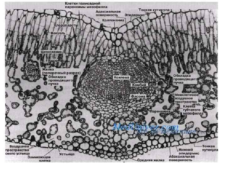 Схема строения устьиц листа растений (А - вид на эпидерму сверху, Б - поперечный разрез устьичного аппарата). 1 - замыкающие клетки, 2 - устьичная щель, 3 - побочные клетки, 4 - дыхательная полость, 5 - эпидермальные клетки, 6 - кутикула , 7 - клетки мезофилла , заполненные хлоропластами.