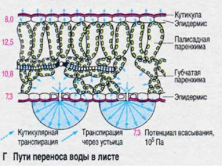 Этапы транспирации • Первый этап — это переход воды из клеточных оболочек в межклетники. • Второй этап — это выход паров воды из межклетников или через кутикулу, или через устьичные щели. • Третий этап транспирации — это диффузия паров воды от поверхности листа в более далекие слои атмосферы.