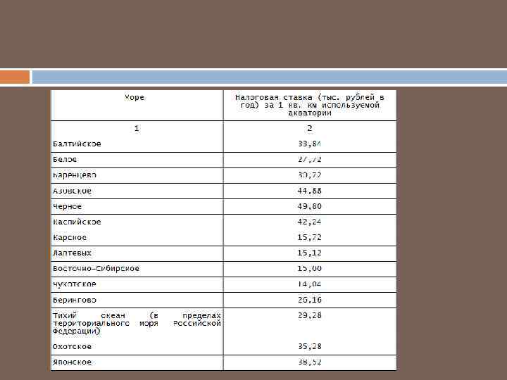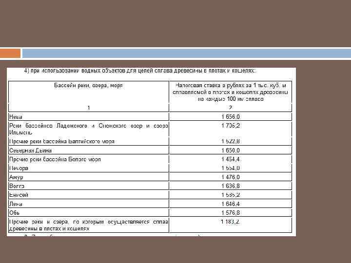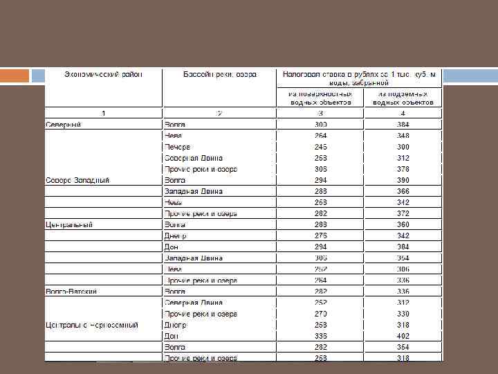 Ставки водного налога ст. 333. 12 Размеры ставок водного налога установлены в рублях за единицу налоговой базы в зависимости от вида водопользования и различаются по экономическим районам, бассейнам рек, озерам и морям. Кроме того, при заборе воды учитывается экономический район, а также является ли водный объект поверхностным или подземным