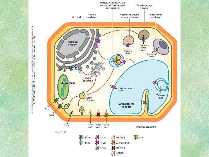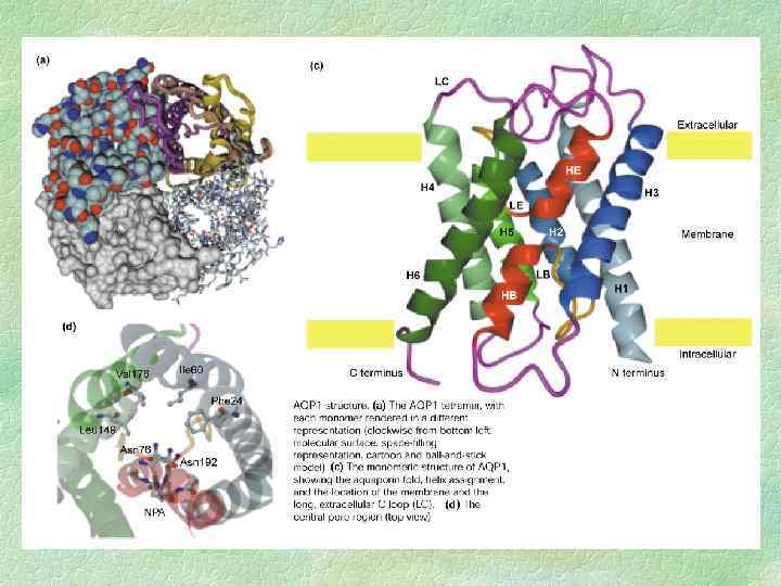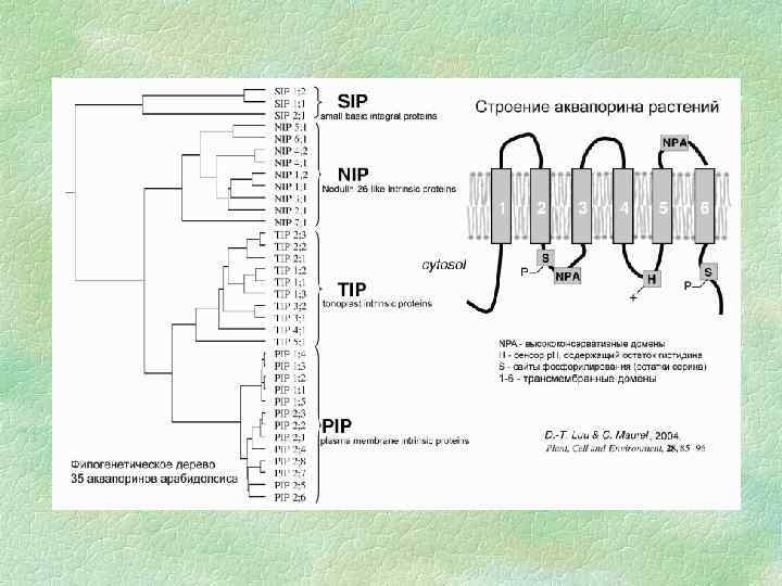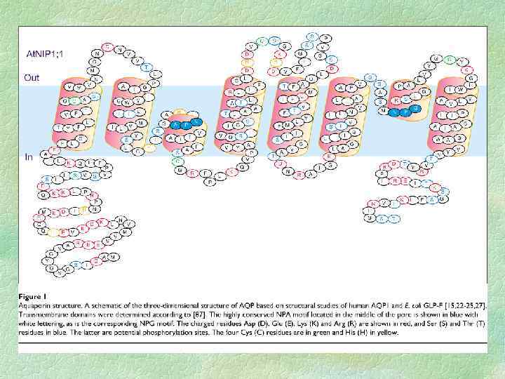 Аквапорины Молекулы воды малы и проходят через клеточные мембраны намного быстрее, чем молекулы других веществ. Для транспорта воды служат белки аквапорины, формирующие в мембране селективные каналы, которые облегчают передвижение воды через мембрану. Такой тип модулирования активности аквапорина влияет только на скорость транспорта воды через мебрану, но не на направление водного потока. Транспортная активность аквапоринов регулируется их фосфорилированием.