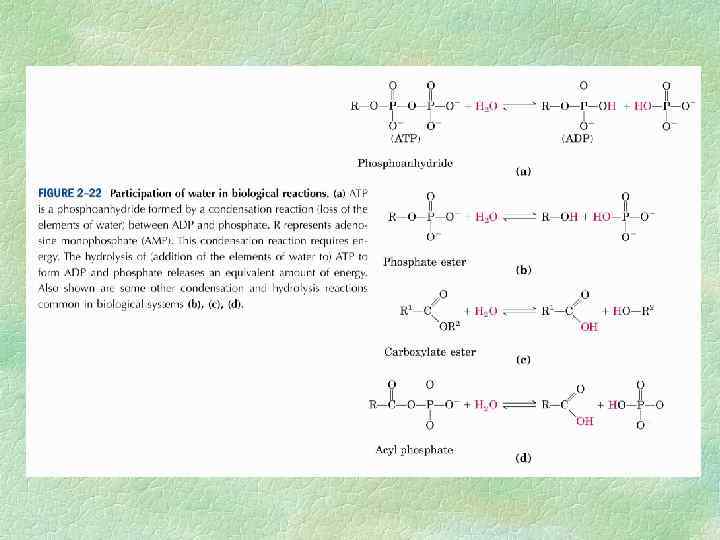 Водные растворы Вода из-за полярной структуры и небольших размеров молекулы является наилучшим растворителем полярных веществ. Растворение, например, кристаллов неорганических солей осуществляется за счет гидратации ионов, входящих в состав растворяемых соединений: Хорошо растворяются в воде также сахара, белки и другие органические соединения, которые содержат полярные группы: СОО , NН 3+, ОН и др. При растворении молекулы воды ориентируются вокруг ионов и полярных молекул, нейтрализуя их электрические заряды. Это ослабляет электростатические взаимодействия между заряженными веществами и повышает их растворимость.
