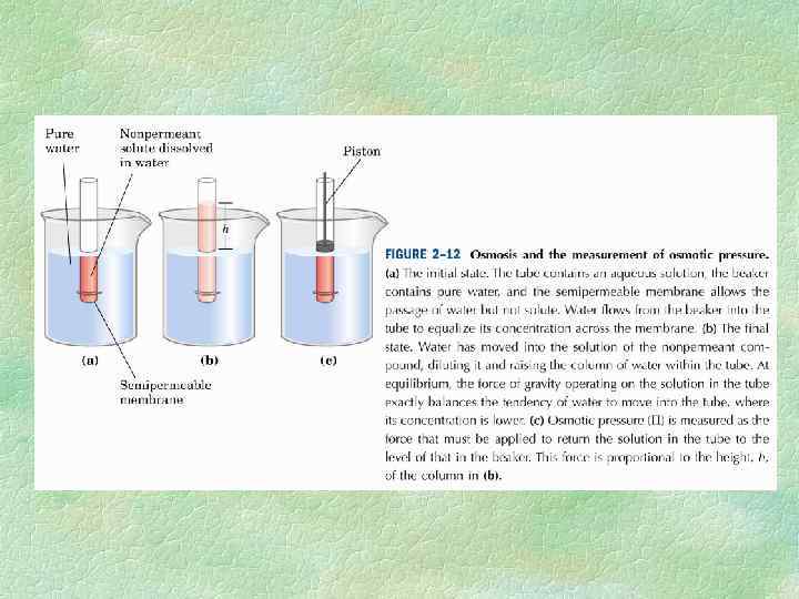 Осмосом называют процесс диффузии воды в раствор, отделенный полупроницаемой мембраной, которая пропускает молекулы растворителя, но не растворенных веществ. Существуют также активные механизмы поглощения воды клетками. Основной движущей силой водных потоков в клетках и тканях растений является градиент осмотического потенциала. Численно осмотический потенциал равен тому давлению, которое необходимо приложить к раствору, чтобы предотвратить поступление в него воды. Если вода диффундирует в раствор, отделенный от нее полупроницаемой мембраной, возникает давление (осмотическое давление), равное по величине, но противоположное по знаку исходному осмотическому потенциалу. Для расчета осмотического давления используют формулу, предложенную Вант-Гоффом: Росм = i·c·RT, i изотонический коэффициент, равный 1+α (n 1), где α – степень электролитической диссоциации; n – количество ионов, на которые распадается молекула электролита. Из уравнения следует, что осмотическое давление определяется концентрацией растворенного вещества. Осмотическое давление выражают в паскалях.