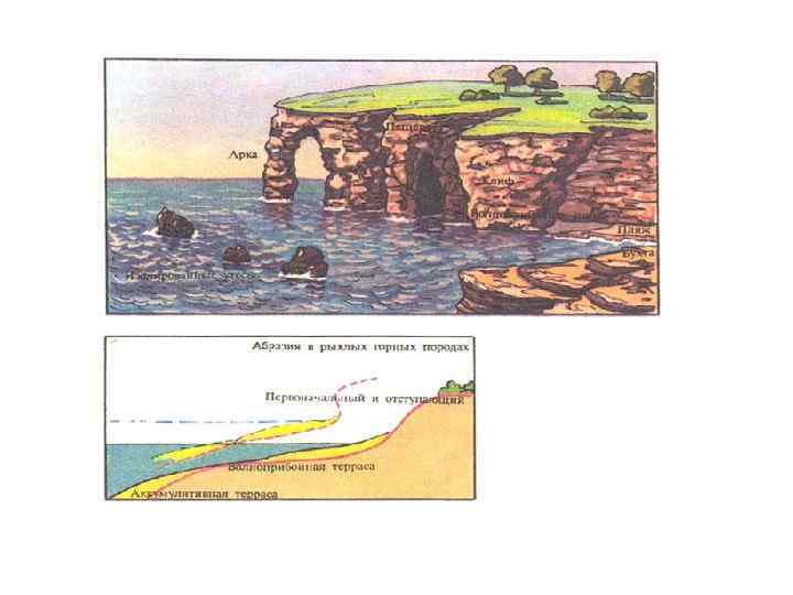 • • • Деятельность морей и озер –образуют абразивные и аккумулятивные формы рельефа с накоплением морских и озерных отложений. Основной фактор развития берегов – движение морской воды(волнение, морской прибой, приливно- отливные движения и виды морских течений). Береговая линия – линия пересечения поверхности моря с поверхностью суши, меняющиеся при трансгрессии и регрессии. Берег –полоса суши, примыкающая к современной береговой линии. Прибрежье –полоса морского дна, примыкающая к берегу и подвергающаяся воздействию волн и прибрежных течений. Абразионный тип берегов – разрушение у берегов за счет прибойных волн с образованием ниш, карниза, клифа (рис. 3) Рис. 3 Абразионный берег. I. III – стадии отступления побережья: 1 -клиф; 2 - волноприбойная ниша; 3 -пляж; 4 -бенч; 5 -подводная аккумулятивная терраса