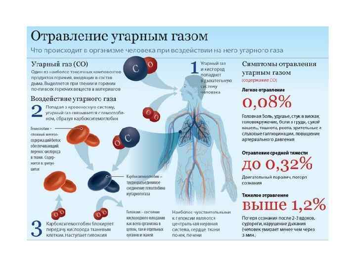 Тяжелая степень тяжести Признаки При отравлении выхлопными газами в тяжелой степени кожа и видимые слизистые имеют ярко-красный цвет с синюшным оттенком. Наряду с потерей сознания быстро прогрессирует коматозное состояние, заканчивающееся остановкой дыхания. Зрачки расширены, не реагируют на свет. Появляются клонические и тонические судороги. Артериальное давление понижено, тоны сердца глухие. Отмечается аритмия дыхания. Может наступить опасный для жизни отек легких. При тяжелой форме отравления выхлопными газами могут быть осложнения, проявляющиеся расстройствами функций центральной нервной системы, органов дыхания и кровообращения.