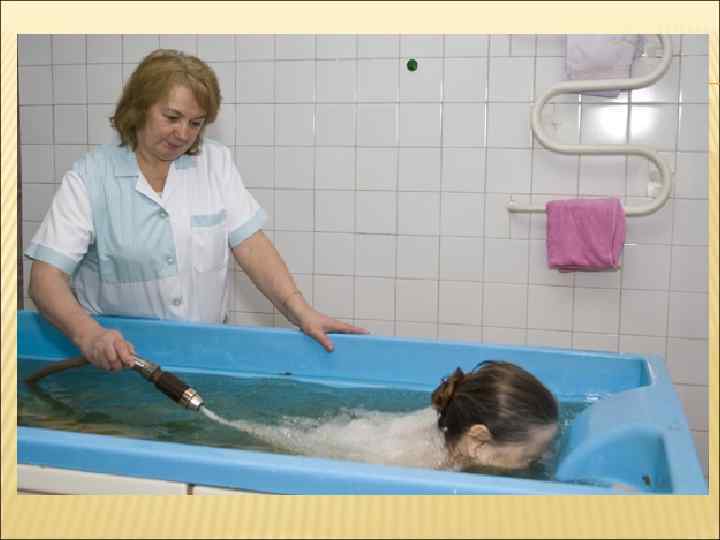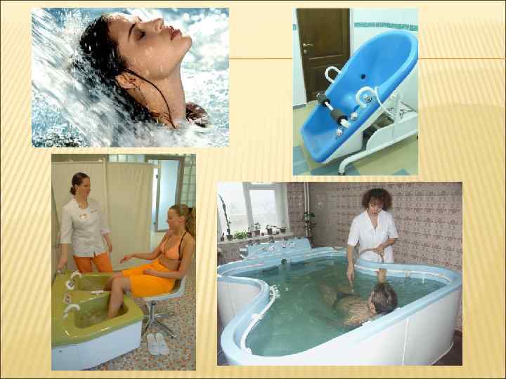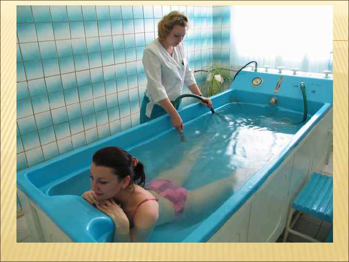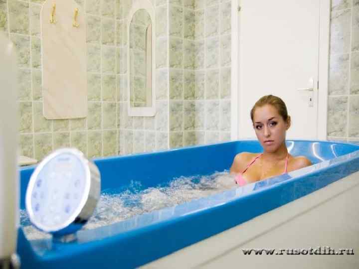Водолечебные процедуры проводят в водолечебницах или водолечебных отделениях в составе санаториев, больниц. В водолечебнице предусмотрены ванное отделение, душевой зал, процедурные кабины, кабинет врача, комната отдыха для среднего и младшего медперсонала. Оборудование водолечебницы включает ванны (керамические, металлические или пластмассовые), аппараты для насыщения воды газом (углекислым, кислородом, азотом), для кишечных промываний, душевую кафедру и т. д. Душевая кафедра, представляющая собой небольшой шкаф с системой приводящих и отводящих водопроводных труб и пультом управления, обеспечивает подведение к установкам медицинских душей пресной воды дозированной температуры и давления. В некоторых водолечебницах имеются лечебные бассейны, в которых проводят лечебную гимнастику в воде, дозированное плавание, купания. Глубина бассейнов для взрослых 1, 2— 1, 8 м, для детей 0, 8— 1 м с равномерным или ступенчатым понижением. Для подводного вытяжения позвоночника нужны специальные емкости. Проводить его в обычном бассейне нельзя, т. к. температура воды в нем составляет 26°— 32°, а для вытяжения позвоночника температура воды должна быть 36— 37°, необходима глубина 2— 2, 2 м. Оптимальная площадь бассейна для проведения лечебной гимнастики группой в 12 человек — 60 м 2.