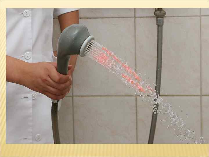 Процедуры водолечения включают душ, ванны, некоторые виды влажных компрессов, кишечные промывания, а также купания, обливания, обтирания, укутывания и др.
