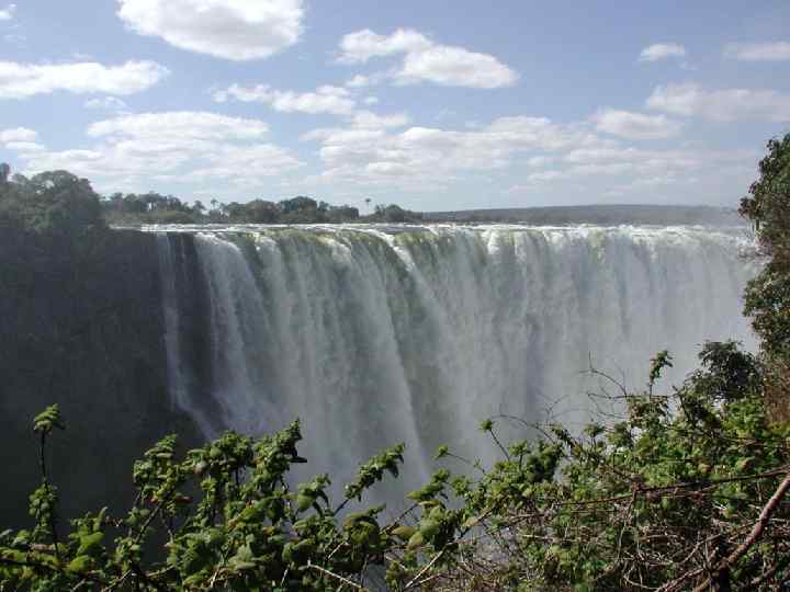 Водопад Виктория § Водопад Виктория на реке Замбези в Южной Африке. Ширина водопада — примерно 1800 метров, высота — 128 метров. Водопад представляет собой необычайное зрелище — узкую пропасть, в которую падает вода. § Шотландский исследователь Дэвид Ливингстон посетил водопад в 1855 году и назвал его в честь королевы Виктории. § В дождливый сезон через водопад проходит до 9100 кубических метров воды в секунду. В это время вода сливается через главный водопад сплошным потоком. В сезон засухи водопад сокращается до нескольких узких струек, брызги и туман почти отсутствуют, поток снижается до 350 кубических метров в секунду.
