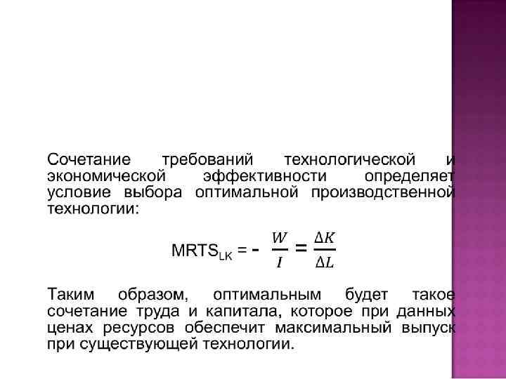 учитывает не только технологические возможности замены ресурсов друг на друга, но и издержки такой замены. Чем более производителен ресурс, тем, обычно он дороже стоит и предприятию необходимо определить такую комбинацию ресурсов, которая бы позволила снизить издержки и увеличить прибыль.
