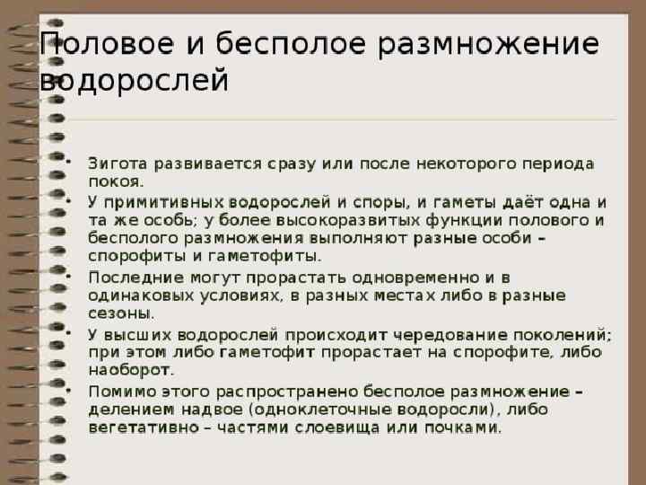 Особенности размножения водорослей Зигота развивается сразу или после некоторого периода покоя. У примитивных водорослей и споры, и гаметы даёт одна и та же особь; у более высокоразвитых функции полового и бесполого размножения выполняют разные особи – спорофиты и гаметофиты. Последние могут прорастать одновременно и в одинаковых условиях, в разных местах либо в разные сезоны. У высших водорослей происходит чередование поколений; при этом либо гаметофит прорастает на спорофите, либо наоборот. Помимо этого распространено бесполое размножение – делением надвое (одноклеточные водоросли), либо вегетативно – частями слоевища или почками.