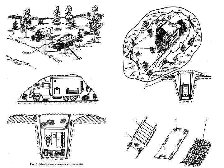 Инженерное оборудование аппаратных (станций) и защита от огневого поражения Начальники аппаратных и станций лично организуют инженерное оборудование и маскировку и руководят выполнением этой задачи. Окопы для личного состава и техники. Для ведения огня, наблюдения и защиты от различных средств поражения в первую очередь устраиваются одиночные окопы для стрельбы. Место для окопа необходимо выбирать так, чтобы иметь хороший обзор и обстрел в заданном секторе и не быть заметным для противника. Для техники устраивают котлованные укрытия, представляющие собой котлован прямоугольной формы с одной или двумя аппарелями для въезда и выезда и бруствером (наиболее распространены тупиковые укрытия). длина укрытия по дну принимается на 50 см, а ширина на 20— 30 см больше соответствующих размеров укрываемой техники. Глубина котлована и высота бруствера должны быть такими, чтобы машины с грузом укрывались заподлицо. для защиты личного состава в районах расположения устраиваются щели на экипаж.