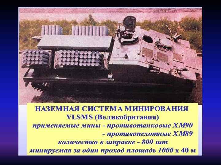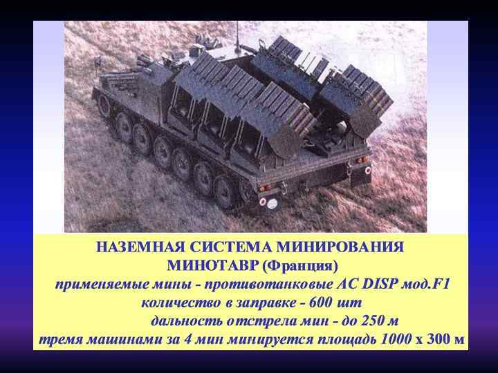 Противотранспортная мина тип 13 (Швеция) Тактико-технические характеристики мины: Тип мины………противотранспортная осколочно - кумулятивная управляемая направленного поражения управляемая Ø Корпус. . . пластмасса Ø Общий вес. . . . 20 кг. Ø Масса ВВ (гексотол). . . . 7. 5 кг. Ø Размеры. . . . . 42 х10 х25 см. Ø К-во готовых убойных элементов. . . 1220 Ø Зона поражения………. . сектор 150 х100 х3 м Ø