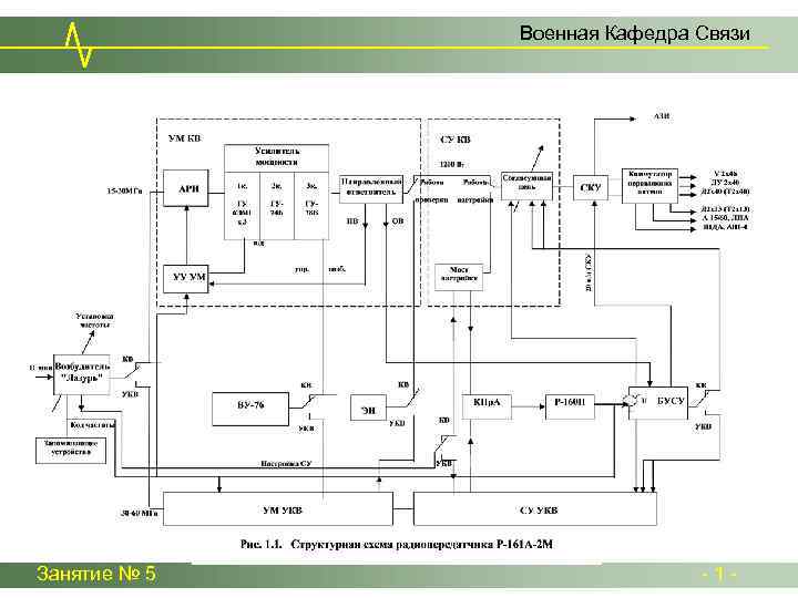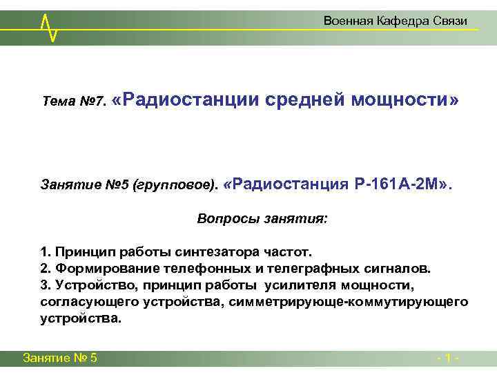 Военная Кафедра Связи Тема № 7. «Радиостанции средней мощности» Занятие № 5 (групповое). «Радиостанция Р-161 А-2 М» . Вопросы занятия: 1. Принцип работы синтезатора частот. 2. Формирование телефонных и телеграфных сигналов. 3. Устройство, принцип работы усилителя мощности, согласующего устройства, симметрирующе-коммутирующего устройства. Занятие № 5 - 1 -