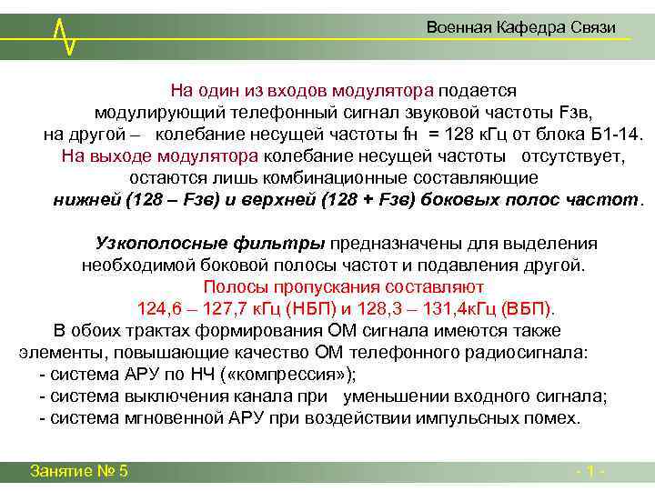 Военная Кафедра Связи На один из входов модулятора подается модулирующий телефонный сигнал звуковой частоты Fзв, на другой – колебание несущей частоты fн = 128 к. Гц от блока Б 1 -14. На выходе модулятора колебание несущей частоты отсутствует, остаются лишь комбинационные составляющие нижней (128 – Fзв) и верхней (128 + Fзв) боковых полос частот. Узкополосные фильтры предназначены для выделения необходимой боковой полосы частот и подавления другой. Полосы пропускания составляют 124, 6 – 127, 7 к. Гц (НБП) и 128, 3 – 131, 4 к. Гц (ВБП). В обоих трактах формирования ОМ сигнала имеются также элементы, повышающие качество ОМ телефонного радиосигнала: - система АРУ по НЧ ( «компрессия» ); - система выключения канала при уменьшении входного сигнала; - система мгновенной АРУ при воздействии импульсных помех. Занятие № 5 - 1 -