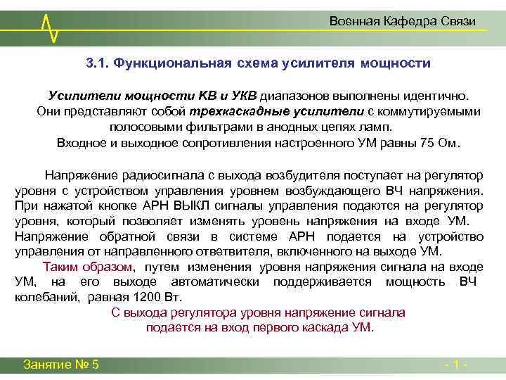 Военная Кафедра Связи 3. 1. Функциональная схема усилителя мощности Усилители мощности KB и УКВ диапазонов выполнены идентично. Они представляют собой трехкаскадные усилители с коммутируемыми полосовыми фильтрами в анодных цепях ламп. Входное и выходное сопротивления настроенного УМ равны 75 Ом. Напряжение радиосигнала с выхода возбудителя поступает на регулятор уровня с устройством управления уровнем возбуждающего ВЧ напряжения. При нажатой кнопке AРH ВЫКЛ сигналы управления подаются на регулятор уровня, который позволяет изменять уровень напряжения на входе УМ. Напряжение обратной связи в системе АРН подается на устройство управления от направленного ответвителя, включенного на выходе УМ. Таким образом, путем изменения уровня напряжения сигнала на входе УМ, на его выходе автоматически поддерживается мощность ВЧ колебаний, равная 1200 Вт. С выхода регулятора уровня напряжение сигнала подается на вход первого каскада УМ. Занятие № 5 - 1 -