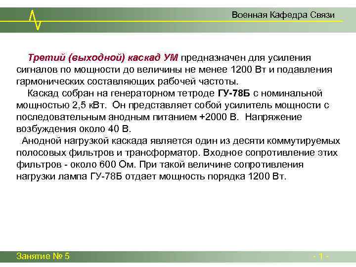 Военная Кафедра Связи Третий (выходной) каскад УМ предназначен для усиления сигналов по мощности до величины не менее 1200 Вт и подавления гармонических составляющих рабочей частоты. Каскад собран на генераторном тетроде ГУ-78 Б с номинальной мощностью 2, 5 к. Вт. Он представляет собой усилитель мощности с последовательным анодным питанием +2000 В. Напряжение возбуждения около 40 В. Анодной нагрузкой каскада является один из десяти коммутируемых полосовых фильтров и трансформатор. Входное сопротивление этих фильтров - около 600 Ом. При такой величине сопротивления нагрузки лампа ГУ-78 Б отдает мощность порядка 1200 Вт. Занятие № 5 - 1 -