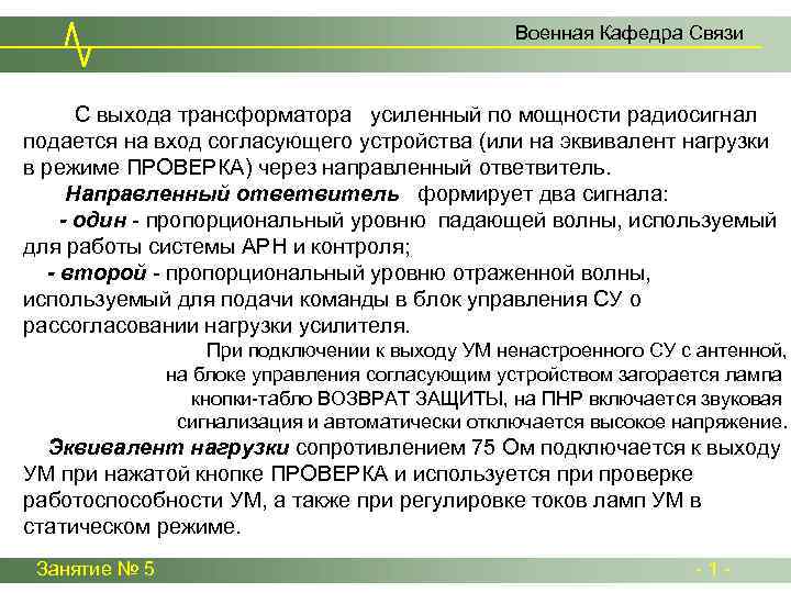 Военная Кафедра Связи С выхода трансформатора усиленный по мощности радиосигнал подается на вход согласующего устройства (или на эквивалент нагрузки в режиме ПРОВЕРКА) через направленный ответвитель. Направленный ответвитель формирует два сигнала: - один - пропорциональный уровню падающей волны, используемый для работы системы АРН и контроля; - второй - пропорциональный уровню отраженной волны, используемый для подачи команды в блок управления СУ о рассогласовании нагрузки усилителя. При подключении к выходу УМ ненастроенного СУ с антенной, на блоке управления согласующим устройством загорается лампа кнопки-табло ВОЗВРАТ ЗАЩИТЫ, на ПНР включается звуковая сигнализация и автоматически отключается высокое напряжение. Эквивалент нагрузки сопротивлением 75 Ом подключается к выходу УМ при нажатой кнопке ПРОВЕРКА и используется при проверке работоспособности УМ, а также при регулировке токов ламп УМ в статическом режиме. Занятие № 5 - 1 -