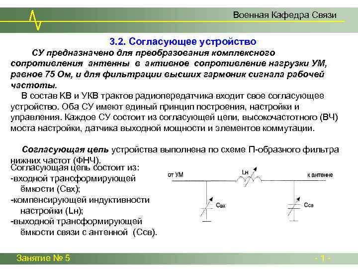 Военная Кафедра Связи 3. 2. Согласующее устройство СУ предназначено для преобразования комплексного сопротивления антенны в активное сопротивление нагрузки УМ, равное 75 Ом, и для фильтрации высших гармоник сигнала рабочей частоты. В состав KB и УКВ трактов радиопередатчика входит свое согласующее устройство. Оба СУ имеют единый принцип построения, настройки и управления. Каждое СУ состоит из согласующей цепи, высокочастотного (ВЧ) моста настройки, датчика выходной мощности и элементов коммутации. Согласующая цепь устройства выполнена по схеме П-образного фильтра нижних частот (ФНЧ). Согласующая цепь состоит из: -входной трансформирующей ёмкости (Свх); -компенсирующей индуктивности настройки (Lн); -выходной трансформирующей ёмкости связи с антенной (Сcв). Занятие № 5 - 1 -