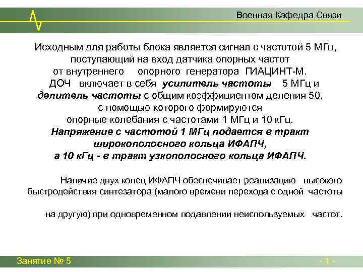 Военная Кафедра Связи Исходным для работы блока является сигнал с частотой 5 МГц, поступающий на вход датчика опорных частот от внутреннего опорного генератора ГИАЦИНТ-М. ДОЧ включает в себя усилитель частоты 5 МГц и делитель частоты с общим коэффициентом деления 50, с помощью которого формируются опорные колебания с частотами 1 МГц и 10 к. Гц. Напряжение с частотой 1 МГц подается в тракт широкополосного кольца ИФАПЧ, а 10 к. Гц - в тракт узкополосного кольца ИФАПЧ. Наличие двух колец ИФАПЧ обеспечивает реализацию высокого быстродействия синтезатора (малого времени перехода с одной частоты на другую) при одновременном подавлении неиспользуемых частот. Занятие № 5 - 1 -