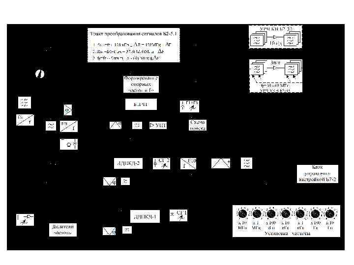 Военная Кафедра Связи 1. Принцип работы синтезатора частот Цифровой синтезатор частот (блок Б 1 -6) предназначен для формирования мелкой сетки частот в диапазоне (12, 8 -14, 8) МГц с шагом 10 Гц. Цифровой синтез частот основан на использовании системы ФАПЧ. Синтезатор состоит из: - два идентичных кольца (узкополосное и широкополосное) импульсно-фазовой автоматической подстройки частоты (ИФАПЧ), - смеситель - фильтр с электронной перестройкой. Каждое кольцо ИФАПЧ состоит из: - синхронизируемый генератор (СГ), - делитель с дробно-переменным коэффициентом деления (ДДПКД), - фильтр низких частот (ФНЧ); - импульсно-фазовый детектор (ИФД). Занятие № 5 - 1 -