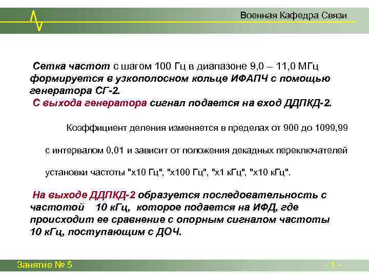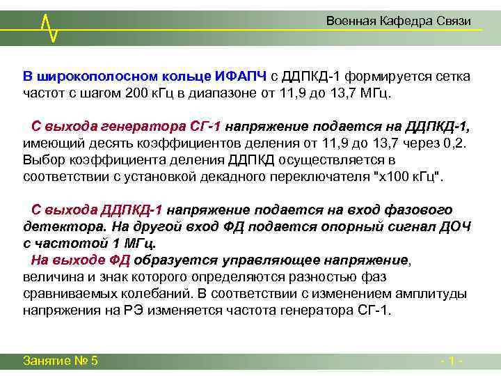 Военная Кафедра Связи В широкополосном кольце ИФАПЧ с ДДПКД-1 формируется сетка частот с шагом 200 к. Гц в диапазоне от 11, 9 до 13, 7 МГц. С выхода генератора СГ-1 напряжение подается на ДДПКД-1, имеющий десять коэффициентов деления от 11, 9 до 13, 7 через 0, 2. Выбор коэффициента деления ДДПКД осуществляется в соответствии с установкой декадного переключателя "х100 к. Гц". С выхода ДДПКД-1 напряжение подается на вход фазового детектора. На другой вход ФД подается опорный сигнал ДОЧ с частотой 1 МГц. На выходе ФД образуется управляющее напряжение, величина и знак которого определяются разностью фаз сравниваемых колебаний. В соответствии с изменением амплитуды напряжения на РЭ изменяется частота генератора СГ-1. Занятие № 5 - 1 -