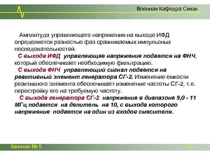 Военная Кафедра Связи Амплитуда управляющего напряжения на выходе ИФД определяется разностью фаз сравниваемых импульсных последовательностей. С выхода ИФД управляющее напряжение подается на ФНЧ, который обеспечивает необходимую фильтрацию. С выхода ФНЧ управляющий сигнал подается на реактивный элемент генератора СГ-2. Изменение емкости реактивного элемента обеспечивает изменение частоты СГ-2, т. е. перестройку его на требуемую частоту. С выхода генератора СГ-2 напряжение в диапазоне 9, 0 - 11 МГц подается на делитель на 10, с выхода которого напряжение подается на один из входов смесителя. Занятие № 5 - 1 -