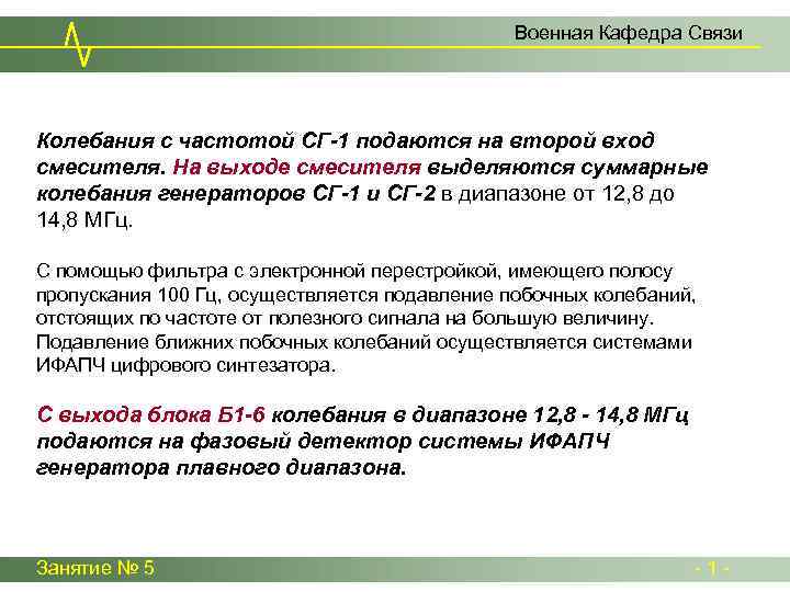 Военная Кафедра Связи Колебания с частотой СГ-1 подаются на второй вход смесителя. На выходе смесителя выделяются суммарные колебания генераторов СГ-1 и СГ-2 в диапазоне от 12, 8 до 14, 8 МГц. С помощью фильтра с электронной перестройкой, имеющего полосу пропускания 100 Гц, осуществляется подавление побочных колебаний, отстоящих по частоте от полезного сигнала на большую величину. Подавление ближних побочных колебаний осуществляется системами ИФАПЧ цифрового синтезатора. С выхода блока Б 1 -6 колебания в диапазоне 12, 8 - 14, 8 МГц подаются на фазовый детектор системы ИФАПЧ генератора плавного диапазона. Занятие № 5 - 1 -