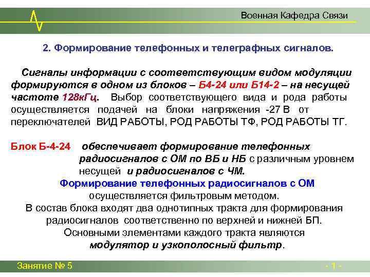 Военная Кафедра Связи 2. Формирование телефонных и телеграфных сигналов. Сигналы информации с соответствующим видом модуляции формируются в одном из блоков – Б 4 -24 или Б 14 -2 – на несущей частоте 128 к. Гц. Выбор соответствующего вида и рода работы осуществляется подачей на блоки напряжения -27 В от переключателей ВИД РАБОТЫ, РОД РАБОТЫ ТФ, РОД РАБОТЫ ТГ. Блок Б-4 -24 обеспечивает формирование телефонных радиосигналов с ОМ по ВБ и НБ с различным уровнем несущей и радиосигналов с ЧМ. Формирование телефонных радиосигналов с ОМ осуществляется фильтровым методом. В состав блока входят два однотипных тракта для формирования радиосигналов соответственно по верхней и нижней БП. Основными элементами каждого тракта являются модулятор и узкополосный фильтр. Занятие № 5 - 1 -