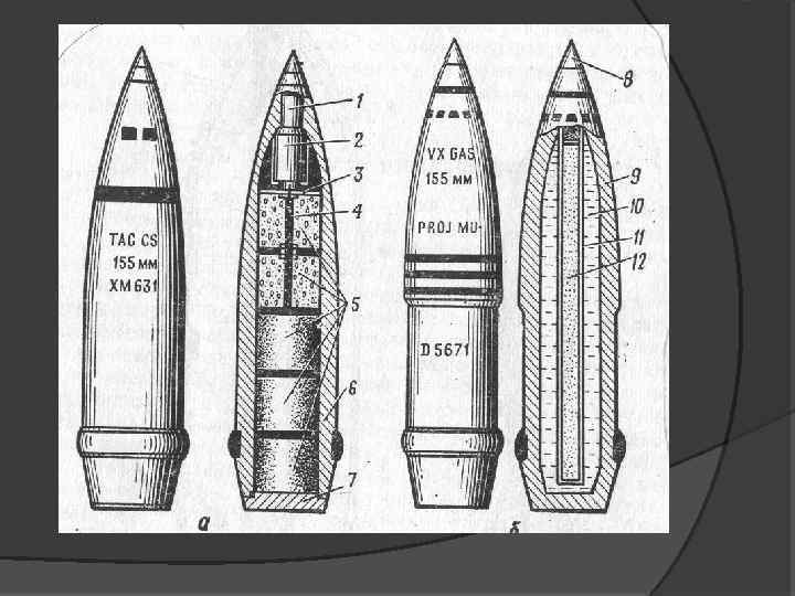 Виды боевого состояния ОВ: пар; аэрозоль; капли. К химическим средствам поражения относятся: химические боеприпасы и боевые устройства. – Химические боеприпасы: артиллерийские химические снаряды и мины; артиллерийские химические бомбы и кассеты; химические боевые части ракет; химические фугасы, шашки, гранаты и патроны. – Химические боевые устройства: выливные авиационные устройства; механические генераторы аэрозолей ОВ.
