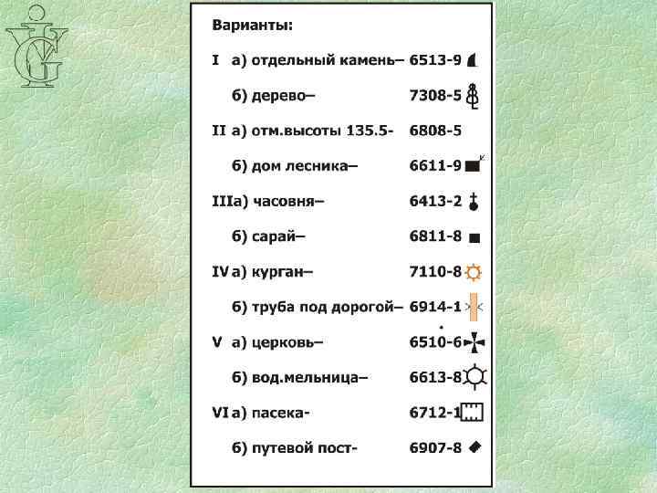 Условные топографические знаки Пояснительные Масштабные знаки – топографические это знаки, которые знаки позволяют отображают получить подробную реальные очертания Внемасштабные характеристику объектаэто знаки, знаки – в местности и соответствующем которые не объектов масштабе отображают реальные очертания объекта Квадрат 6610 Следующий Рассмотрим 7210 квадрат 7212 7213 7113 Квадрат 6713 • Масштабные • Внемасштабные • Пояснительные