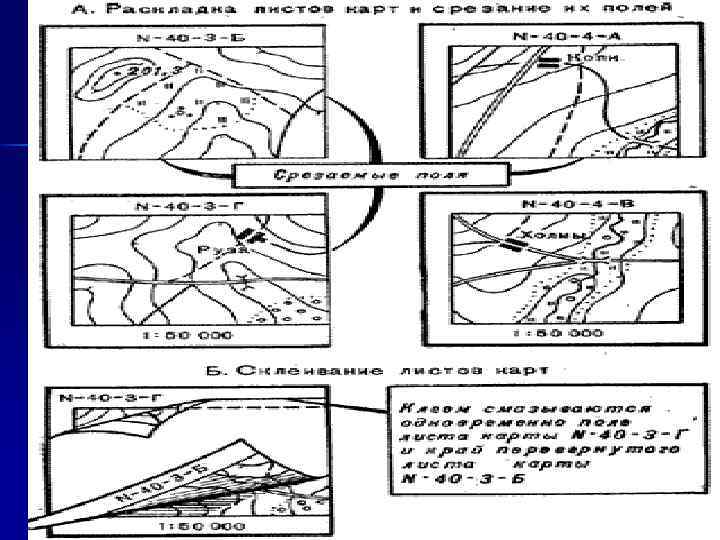 в) Склеивание карты выполняют в такой последовательности: -Раскладывают листы карты согласно их номенклатуре и намечают поля, которые требуется срезать. -Срезают намеченные поля, пользуясь острым ножом или лезвием безопасности бритвы. Обычно у всех листов, кроме крайних справа, срезают правые (восточные), а также нижние (южные) поля, кроме нижних листов склейки. -Склеивают листы сначала в колонны (снизу вверх), а затем колонны между собой (справа налево).