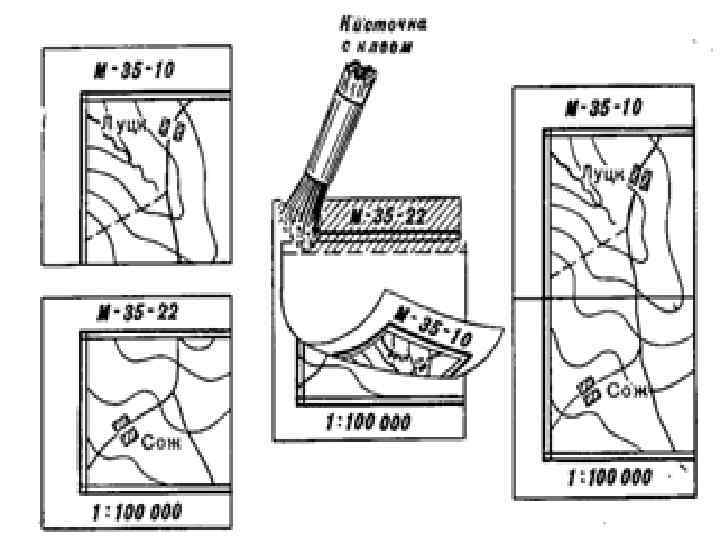 Для склеивания каждый верхний лист накладывают на нижний и смазывают склеиваемые края обеих листов гонким ровным слоем клея. Затем, перевернув верхний лист, аккуратно накладывают его на северном поле нижнего листа, точно совмещая при этом их рамки, а также выходы линий координатной сетки и контуров. Полосы склейки осторожно разглаживают чистой тряпкой, удаляя пузырьки воздуха.
