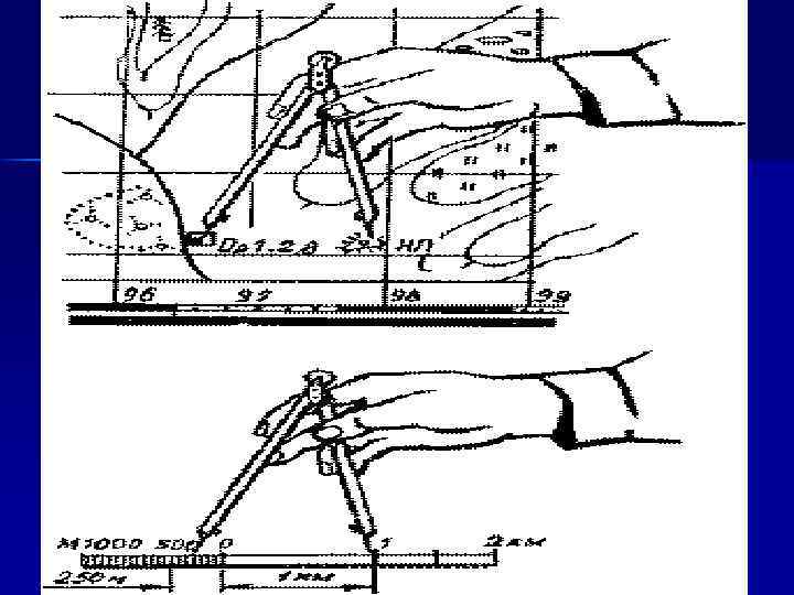 n n Делают это так: ножки циркуля устанавливают в точках карты, расстояние между которыми требуется определить; не изменяя раствора циркуля, прикладывают его к линейному масштабу так, чтобы одна из ножек точно совпала с нулем или с подписанным делением вправо от нуля, а другая расположилась бы на мелких делениях влево от нуля; сумма отсчетов, прочитанных по масштабу против обеих ножек циркуля, дает искомое расстояние. При откладывании заданных расстояний на карте порядок работы обратный: устанавливают необходимый раствор циркуля по линейному масштабу, затем откладывают на карте от указанной точки в нужном направлении отрезок, равный раствору циркуля