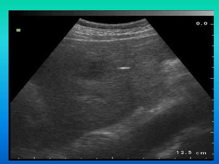 УЗ признаки инородного тела в свободной брюшной полости (большая хирургическая салфетка через 6 мес после операции):