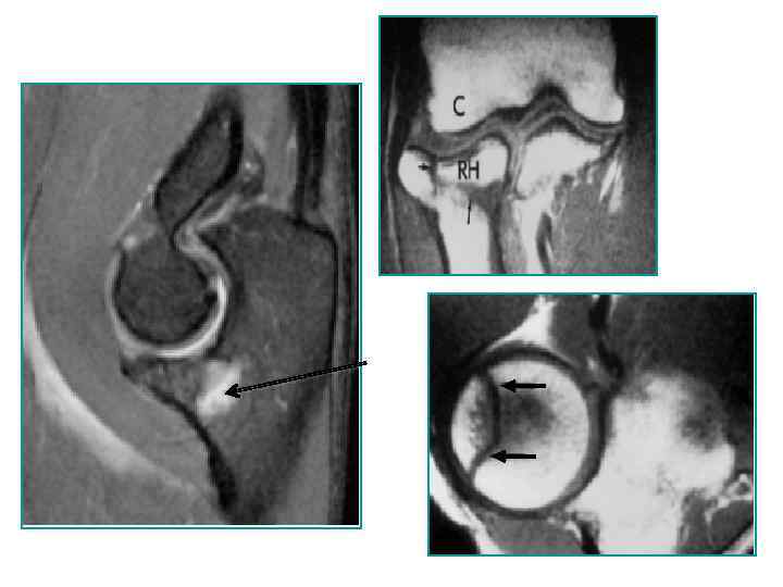 РАССЕКАЮЩИЙ ОСТЕОХОНДРИТ ЛОКТЕВОГО СУСТАВА (остеохондропатия) Поражает головку плечевой кости. Характеризуется развитием отграниченного асептического некротического процесса, повреждением суставного хряща и развитием субхондрального перелома. Заболевание развивается преимущественно в молодом возрасте, большей частью у мужчин СТАДИИ РАССЕКАЮЩЕГО ОСТЕОХОНДРИТА (по К. Воhndorf, 1998 г) I стадия – нормальное изображение суставного хряща на поверхности участка некроза II стадия – повреждение хряща, проявляется понижением интенсивности сигнала на Т 1 -ВИ и повышением на Pd-Fs и Т 2 -(Fs)-ВИ III стадия – отграничение фрагмента, сопровождается появлением на Pd-Fs и Т 2(Fs)-ВИ высокоинтенсивной полоски по контуру участка некроза IV стадия – полное нарушение целостности суставного хряща и отделение фрагмента от эпифиза кости