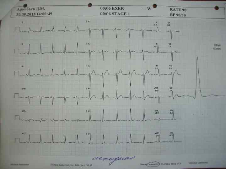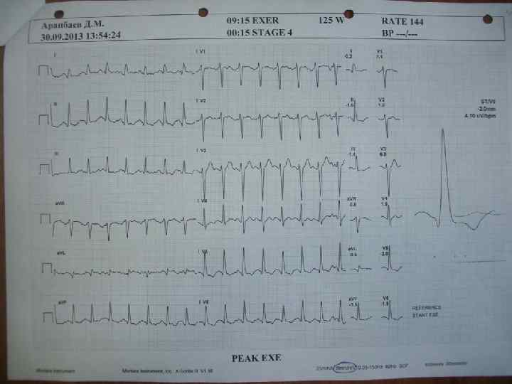 Трактовка результатов, формулировка заключения: «Нагрузка ступенчатая, непрерывновозрастающая 50 Ватт - …. . - 150 Ватт» ; «проба прекращена на. . . мин. … ступени (… Ватт) по достижению субмаксимальной ЧСС … в мин. Ангинозных болей не было. Ишемических изменений сегмента ST не выявлено. Проба на скрытую коронарную недостаточность отрицательная» ; если субмаксимальная ЧСС не достигнута, проба прекращена по другим причинам – указать: - «проба прекращена на … мин. … ступени в связи с ангинозной болью, горизонтальной депрессией сегмента ST на … мм в отведениях … при пороговой ЧСС … в мин. , сохранялась до … мин. восстановительного периода» - «проба прекращена в связи с гипертензивной реакцией АД (…/… мм. рт. ст. ) или в связи с одышкой / усталостью / отказом пациента, …… Достигнута ЧСС … в мин. (…% от макс. )»