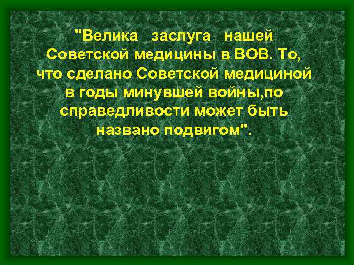 "Велика заслуга нашей Советской медицины в ВОВ. То, что сделано Советской медициной в годы минувшей войны, по справедливости может быть названо подвигом".