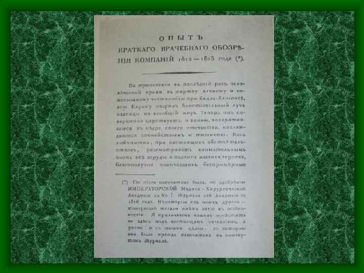 «…еще с большими трудностями, чем диагноз, соединено лечение внутренних болезней в госпиталях на театре войны. Это лечение гораздо разнообразнее и требует более индивидуализирования больных со стороны врача, чем наружные повреждения»
