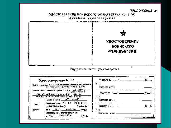 l l Секретные отправления выдаются по предъявлении удостоверения воинского фельдъегеря. Оно должно иметь фотокарточку и личную подпись владельца. Удостоверение подписывается командиром в/части и заверяется гербовой печатью. Удостоверение выдается фельдъегерем в/части и узла (станции) ФПС. Удостоверения личности, военные билеты, паспорта должны иметь фотокарточки, подписи владельцев и отметки о прохождении службы или принадлежности к семье военнослужащего. Отметки должны быть подписаны командиром воинской части и заверены гербовой печатью.