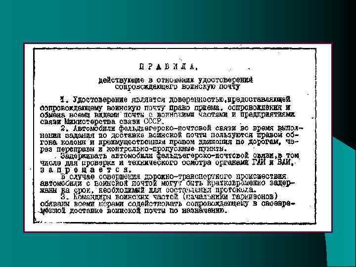 Удостоверение воинского фельдъегеря является доверен ностью, предоставляющей воинскому фельдъегерю право на соп ровождение и обмен совершенно секретными и секретными от правлениями с воинскими частями и предприятиями специаль ной и фельдъегерской связи Министерства связи СССР. Автомобили и другие подвижные средства фельдъегерско почтовой связи во время выполнения задания по доставке во инской почты пользуются правом обгона колонн и преимущест венным правом движения по дорогам, через переправы и конт рольно пропускные пункты. Органам комендантской службы, ГАИ и ВАИ запрещается задерживать, проверять и производить технический осмотр ав томобилей и других подвижных средств фельдъегерско почтовой связи. В случае совершения дорожно транспортного происшест вия автомобили с воинской почтой могут быть кратковременно задержаны на срок, необходимый для оказания помощи постра давшим и составления протокола.