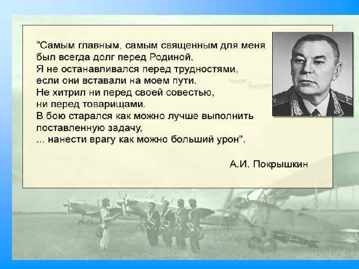 Летчики – герои. Первая медаль «Золотая звезда Героя Советского Союза» была вручена летчику Анатолию Ляпидевскому в 1934 году за спасение экипажа парохода «Челюскин» . В годы Великой Отечественной войны летчикам А. И. Покрышкину и И. Н. Кожедубу это звание было присуждено трижды. 2420 были удостоены звания Героя Советского Союза, в том числе 29 военных летчиц. Тысячи военных летчиков были награждены правительственными орденами и наградами за свой ратный подвиг в годы войны и в мирное время.